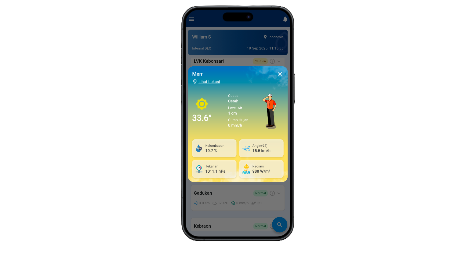 Flood Viser menyediakan fitur pemantauan langsung terhadap kondisi pompa dan cuaca di sekitar, memungkinkan pengguna mengambil keputusan cepat berdasarkan data yang diperbarui secara real-time.